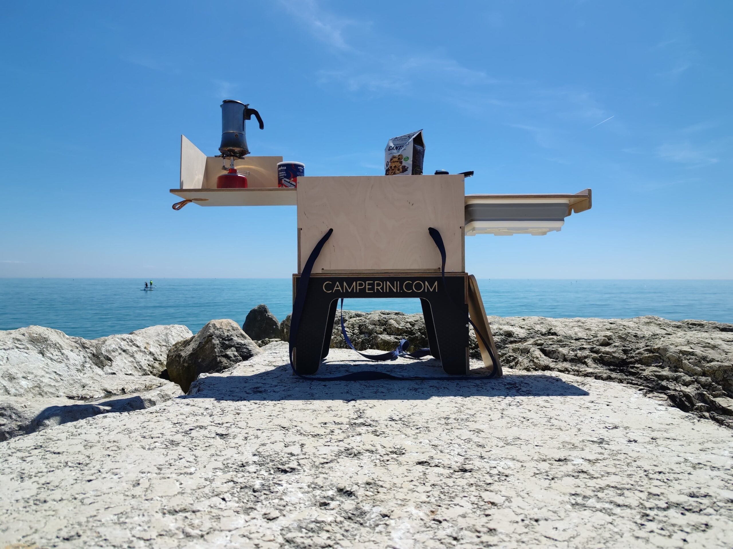 Camperini SMART – Bærbart Komplet Køkken Portabilitet og Anvendelighed Camperini SMART er ideel til at tage med overalt. Den er kompakt nok til at passe i bagagerummet på en bybil og kan bruges i et telt, autocamper, bil, lastbil eller endda i haven. Materiale og Design Kassens krop er fremstillet af melaminbelagt krydsfinér, tryklakeret for at fremvise træets naturlige skønhed og sikre hvert sæts unikhed. Som et naturmateriale kan træet indeholde inclusions, knaster, små hulrum eller splinter, hvilket tilfører charme til produktet. Plywoodens hygroskopiske egenskaber kan forårsage en vis svulmen. Vedligeholdelsesråd Materialet kan være følsomt over for vejrforhold. Undgå at lade det stå i fuld sol for at undgå misfarvning, og vær opmærksom på, at for meget fugt kan få plywooden til at svulme eller delaminere. Designet til madlavning både indenfor og udenfor bilen. Ideel til situationer, hvor andre sover i bilen, mens du laver mad. Sættet inkluderer: En base til madlavning. To sammenklappelige arbejdsborde. Et arbejdsbord til vasken. En sammenklappelig silikonevask på et separat bord. En 5-liters vandbeholder. En vandpumpe med batteri, USB-opladbar inklusiv kabel. Transportremme til lettere at bære sættet. En gasbrænder med vindskærm og sikkerhedsventil. Skabe til opbevaring af køkkenudstyr og madvarer. Specifikationer Mål og Vægt Udvendige mål på samlet sæt: 33 cm x 33 cm x 56 cm Udvendige mål på udfoldet bordplade: 33 cm x 33 cm x 140 cm Indvendige mål (bakke): 20 cm x 30 cm x 52 cm Vægt af kassen: 9,5 kg Dimensioner på Skammel Udvendige mål: 35 cm x 35 cm x 57 cm Vægt af skammel/kabinet: 5,1 kg Materiale og Konstruktion Lavet af melaminbelagt krydsfiner, tryklakeret. Viser naturligt træs skønhed. Hvert sæt er unikt på grund af naturmaterialernes karakter. Kan indeholde indeslutninger, knaster, små hulrum eller splinter, som tilføjer charme. Hygroskopisk natur kan forårsage let svulmen og påvirke glidende dele. Bemærkninger om Vedligeholdelse Materiale kan være følsomt over for vejrforhold. Undgå at efterlade det i fuld sol, da det kan forårsage misfarvning. For meget fugt kan få krydsfineren til at svulme eller delaminere Vedligeholdelsesråd Materialet kan være følsomt over for vejrforhold. Undgå at lade det stå i fuld sol for at undgå misfarvning, og vær opmærksom på, at for meget fugt kan få plywooden til at svulme eller delaminere. Leveringstid: ca. 2-6 uger (Afhænger af sæson og om produkterne er klar til afsendelse hos leverandøren, eller om modulerne først skal klargøres).