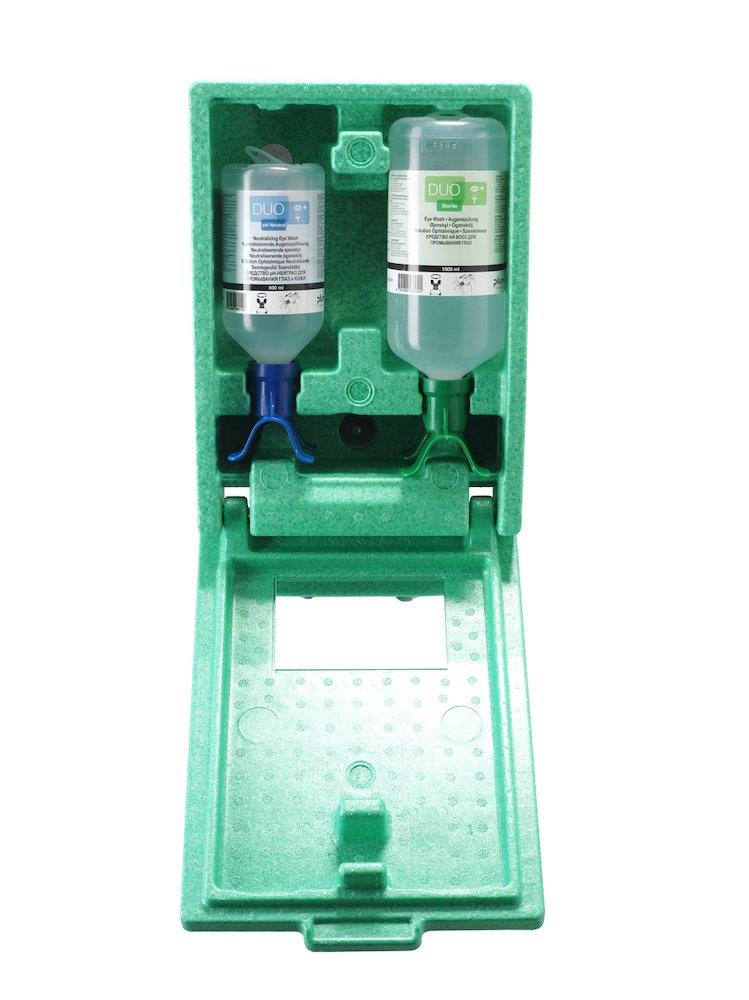 Øjenskyllestationen er fremstillet af støvtæt og slagfast flamingo. Indeholder 1,0 l PlumØjenskyller Duo og 500 ml pH Neutral Duo. Statinen er beregnet til ophæng påvæggen og er udstyret med piktogram påfronten og spejl indvendig i låget. Er særligt velegnet til steder hvor der er meget støv og snavs, samt hvor der er risiko for ulykker med syrer/baser og fremmedlegemer. Alleøjenskyllere fra Plum er CE-mærket i henhold til reglerne for medicinsk udstyr. Desuden er de naturligvis sterile, såder ikke tilføres bakterier fra væsken tiløjet under skylningen.